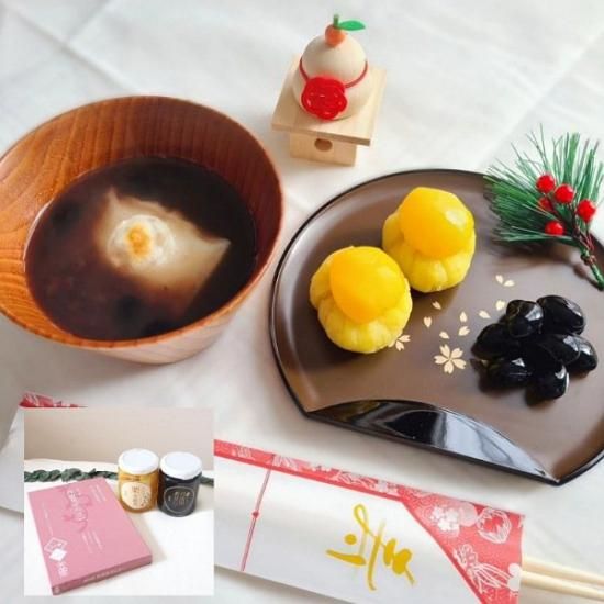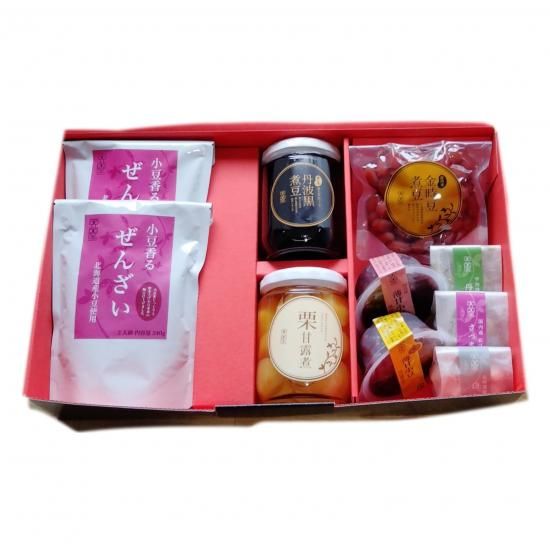 ぜんざい、丹波黒煮豆、栗甘露煮、金時豆、薄甘小豆、プチ甘納豆がセットになったこの商品は、年末年始の贈り物として最適です。